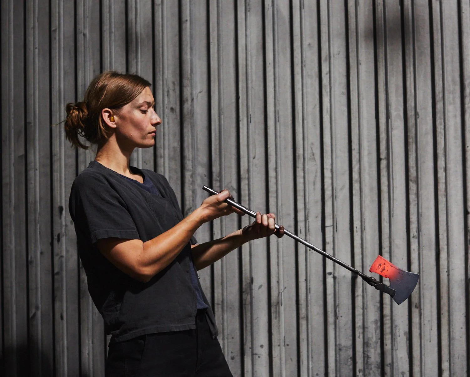 I smedjan slår värmen och mörkret emot oss när vi kliver in. Gnistor sprakar i mörkret och värmen vibrerar i luften. Här arbetar jag med de befintliga ljuset. Vid något tillfälle balanserar jag på en pall för att hitta den rätta vinkeln samtidigt som jag aktar mig noga för att inte komma för nära det glödande stålet som åker på valsar runt i rummet.