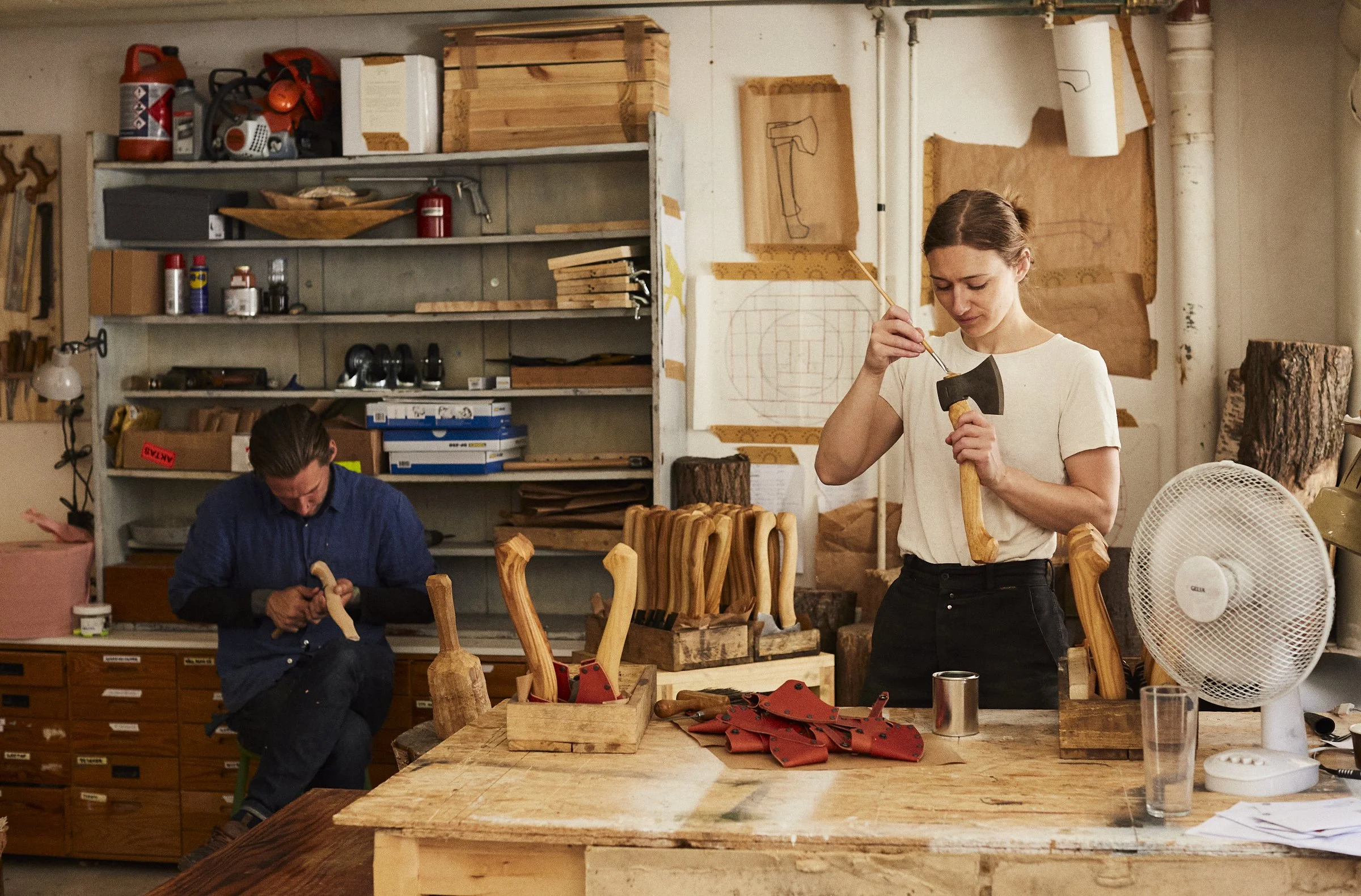Efter smidet tar en annan del av hantverket vid. I sin verkstad formar Julia yxskaft, oljar in träet, slipar eggen och monterar yxhuvudet. Bilderna visar de nyoljade skaften, stålets skärpa och händerna som metodiskt arbetar fram den färdiga yxan.